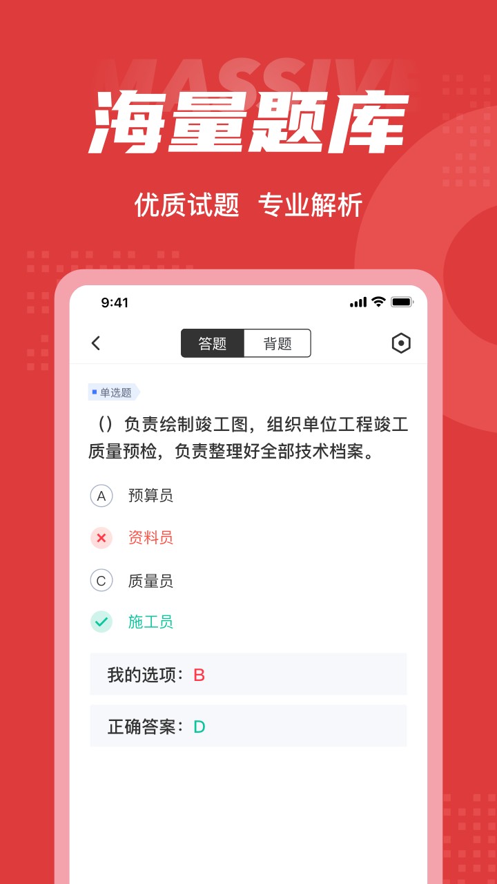 施工员题库内含考点练习,通用卷以及地区卷模拟练习,以及按照固定考试比重的随机式的抽题的真题考场,成绩单实时记录考试数据,一点一滴的反馈考生近期学习状态以及自我正确率的提升,给予考生通过考试的信心。