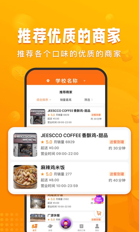 涵盖校内商家外卖、校门口商家外卖等,以足不出寝,送餐到舍为宗旨