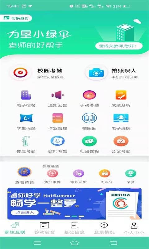 为垦小绿伞app为教师提供专业的移动端办公服务平台,集学生管理、办公管理、家校沟通于一体的校园管理工具,为教师提供更高效的教学体系,提升教学质量,更好的管理学生学习状态,联合家长共同教育管理学生学习成长!