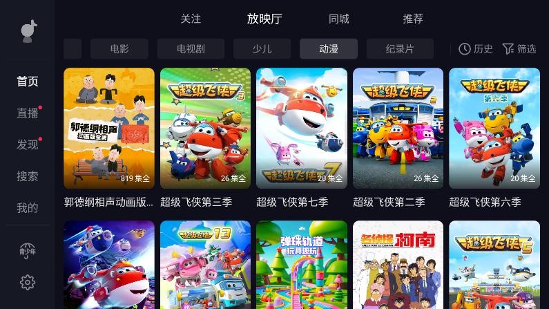 放映厅升级:新增历史与筛选面板,长视频分区加载更快;少儿频道完善题材标签与护眼提醒。