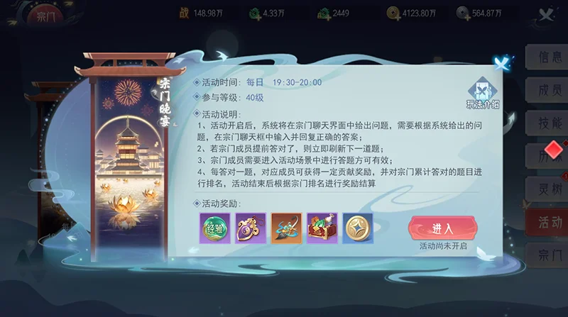 开启后可以与宗门其他成员一起烤火、答题、开启宗门密码宝箱等,在宗门领地场景中还能持续获得经验。