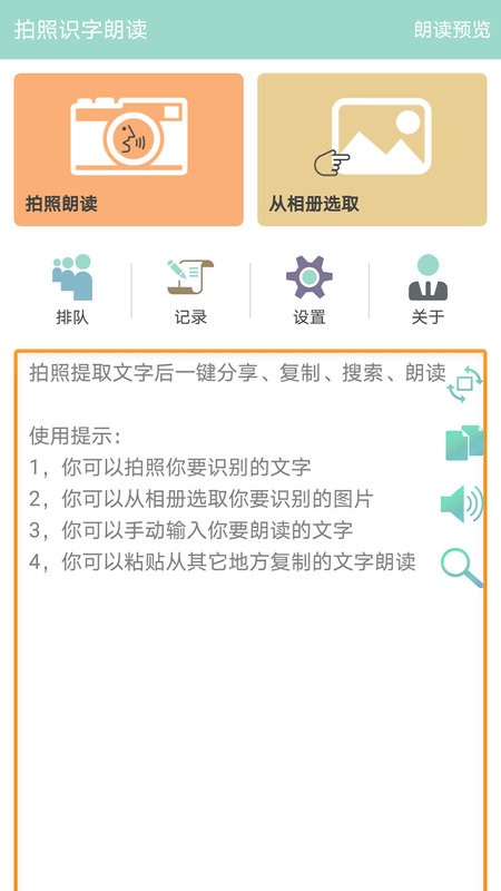 拍照识字朗读软件是款拍照智能识别工具,并为用户提供语音朗读功能,为用户提供更实用的手机拍照文字识别工具,支持一键拍照,或直接相册提取,为用户提供多种识别方式!
