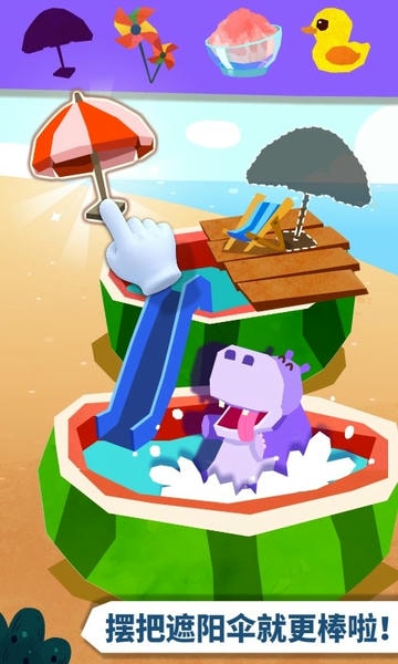 河马先生很怕热,给它打造个西瓜泳池如何?将西瓜一分为二,挖出果肉,泳池的大致构造就出来啦。