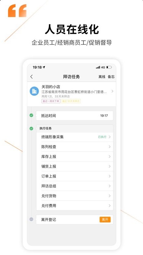 消费品行业,企业需要对业务员拜访行为进行规范化管理,掌握终端门店、库存、陈列,实现对外勤拜访的管理闭环.