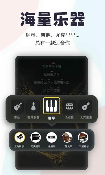 提供钢琴、吉他2种乐器弹唱。按键提示,每个音符对应的按键都会在歌曲上提示,让包你一眼就学会弹奏,不懂乐器也能自弹自唱,是你的随身库乐队喔
