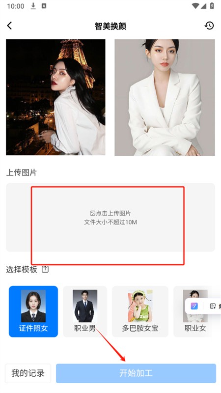 3、选择任意功能,按照提示上传图片,选择合适的模板,点击开始加工,即可美颜