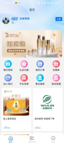 1. 首页展示与活动入口:首页顶部展示用户店铺或身份信息,下方以轮播或大图形式推送主推活动和明星商品,并提供“每天签到”“礼品兑换”“加入我们”“售后服务”“投诉受理”等常用功能入口。
