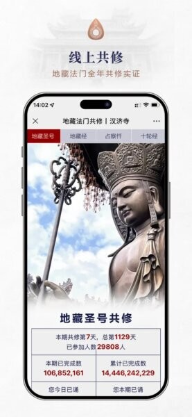 全年线上共修:围绕地藏圣号、地藏经、占察忏、十轮经等专题设置长期共修项目,实时显示本期天数、参与人数、累计持诵次数,让修学进度可见、可追溯,也更容易坚持。