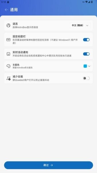 多语言与主题切换:在“通用”设置中,用户可以选择AstroBox显示的语言(如中文简体等),并自定义主题色,打造更符合个人习惯的视觉风格。