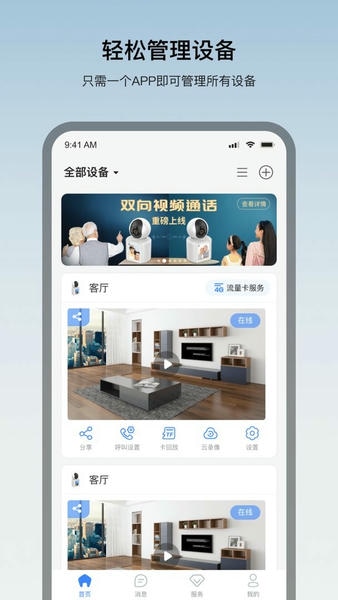 应用程序通过配备的设备,为您提供方便的双向视频通话功能,让您可以更加轻松地与家中无法使用手机的老人和小孩进行交流。