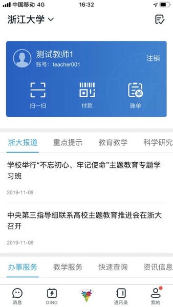 师生可以查看校园卡余额、图书借阅、工资、酬金、成绩、学费等信息,需要通过浙大通行证登录方可访问