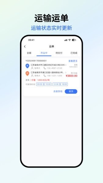 运单全流程可视:在“运单”页区分全部/作业中/待支付/已完成,装卸两端联系人与电话清楚呈现,预计收益一目了然。