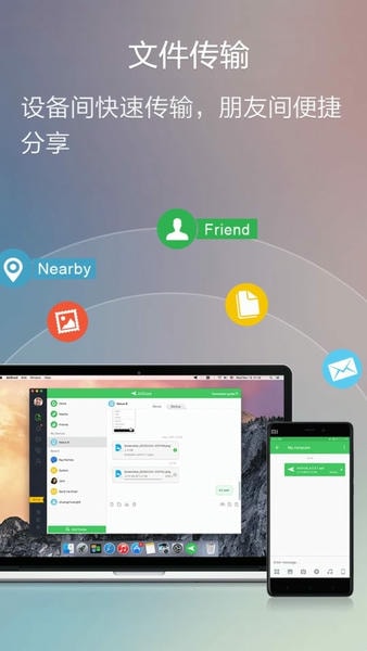 不仅可以给自己传,也可以添加好友或者局域网内搜索附近的好友,在线传输。