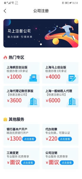 马上创业网是一个专为中小企业服务的APP,主要提供医疗器械服务、审计服务、知识产权服务、财税咨询、注册公司、代理记账、商标注册、专利申请、社保代理、法务代理等一站式的服务,借助移动互联网技术,改善并升级企业服务状态,实现了新形势下中小企业所需要的企业服务