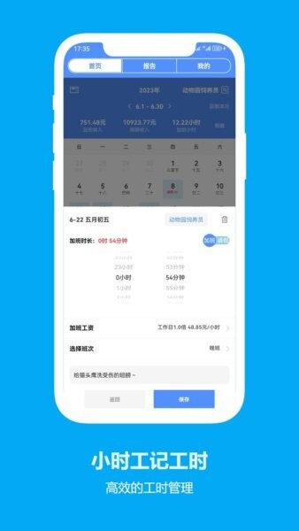 第三步:开始记工时:在首页日历中点击当天日期,填写“上班时长/加班时长/请假时长”等信息;如有需要,补充备注(例如“临时顶班2小时”)。点击保存即可。