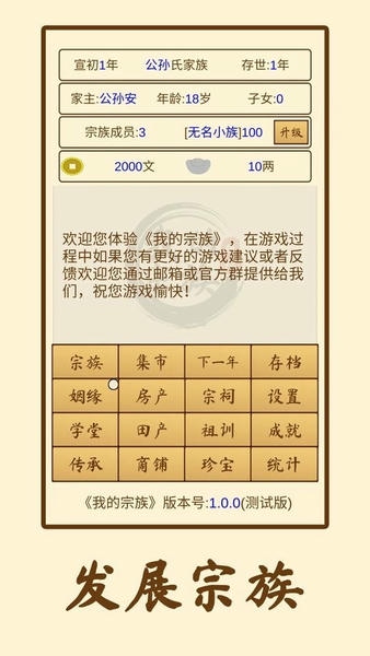 以模拟经营为玩法的文字类游戏,您将扮演一名宗族家主,开创宗族,经营产业,繁衍后代,通过各种玩法发展和壮大您的宗族,以您的聪明才智带领宗族走向辉煌!开创宗族,经营产业,繁衍后代。