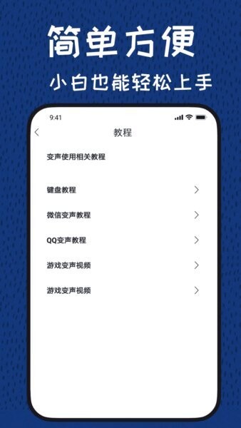 4. 简单方便,小白也能轻松上手:内置教程页,覆盖键盘教程、微信变声教程、qq变声教程、游戏变声视频等,跟着步骤做,几分钟就能玩明白。