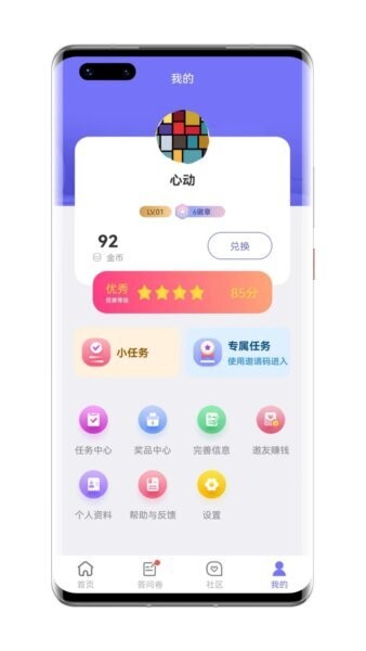 从首页开始,你能看到每日任务、问卷精选、金币商城、签到有礼等核心入口;在“答问卷”板块,可按专区浏览不同类型问卷并查看奖励与截止时间;在“社区”板块,可围绕今日话题参与评论与互动;在“我的”页面,个人等级、徽章、金币余额、任务中心与帮助反馈一目了然,让每一次参与都更有目标、更可控。