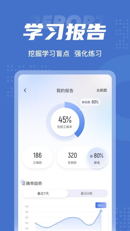 2、提供强大的搜题功能,支持文字、语音、拍照搜题,提供学习报告分析,让用户更加清楚自己的学习情况,更加有针对的学习。