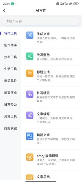 包含生成文章、改写润色、标题生成、扩写精灵、文章续写、精简文章、文章总结、emoji表情翻译等。