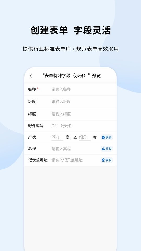 关注外业工作过程中数据产出效率与质量的移动应用,是户外人员的记录伙伴。提供的自定义工程表,可支持用户根据记录需要,添加文本、数字、照片等自定义记录字段及属性。