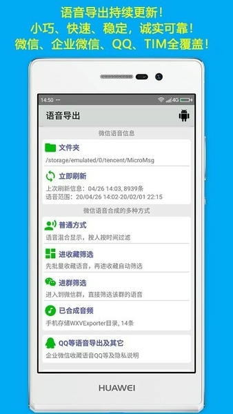 语音合并软件(改名语音导出)是一个帮助大家将qq,微信等软件里的语音以mp3的形式导出的软件,能够兼容各大常用的应用软件,精准识别语音,