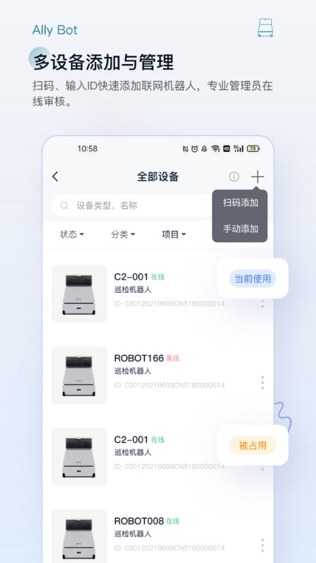 扫码、输入ID快速添加联网机器人,专业管理员在线审核。