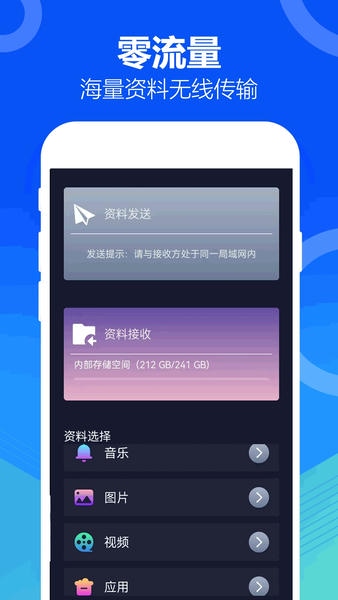 手机互传搬家app实现无网面对面互传,操作简单,传输便捷。精简的操作界面,详细的文件分类,帮助用户高效进行各项文件以及应用的传输,让你能够更好的进行手机数据互传,不用耗费任何流量就完成文件以及应用的传输!