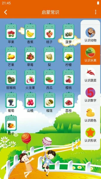 提供了多种启蒙常识知识内容,收录了汉语拼音、英语ABC、数字、颜色、水果、动物、蔬菜等启蒙常识知识,方便幼儿认识日常物品寓教于乐开心学习。