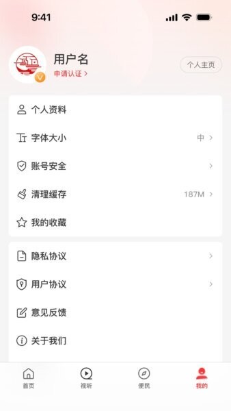 包含个人资料、字体大小、账号安全、清理缓存、我的收藏、隐私协议、用户协议、意见反馈、关于我们等功能,覆盖使用过程中的常见设置与管理需求。
