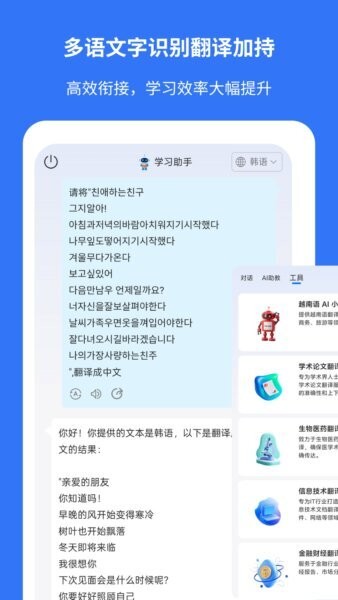 提供自然流畅的译文输出,并结合句子结构进行理解辅助;可用于学习工作、旅行出行与兴趣社交等不同语域。