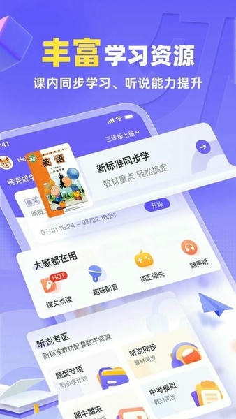 -同步听说:教材同步课文听读跟读,提供单词级的即时反馈,细化训练颗粒度;