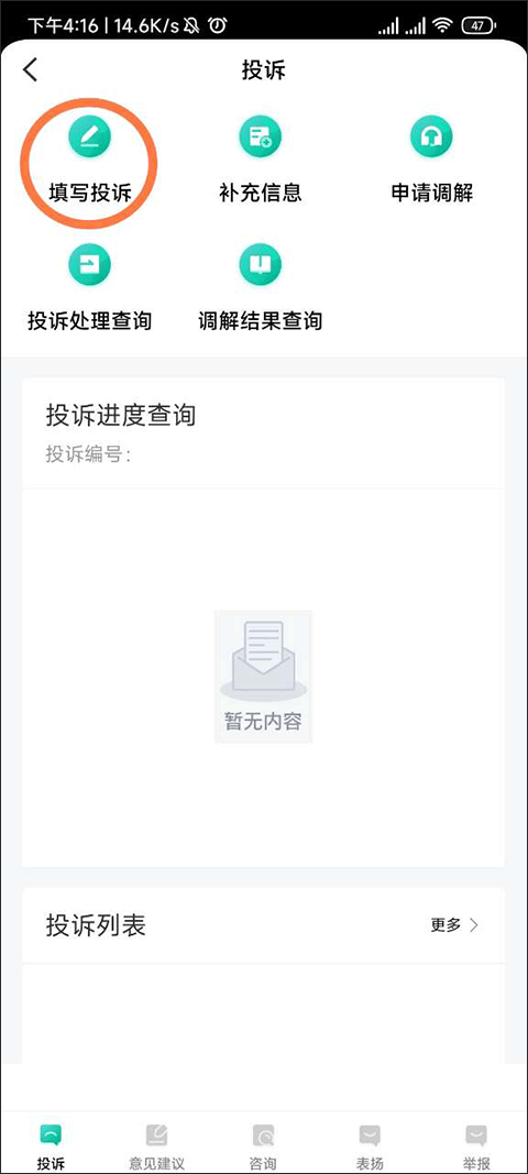进入投诉界面后找到填写投诉并点击。