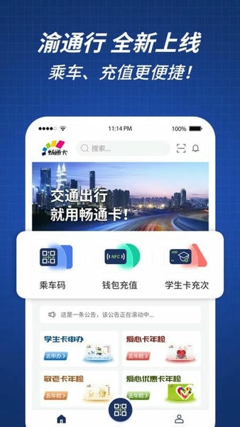 重庆城市通卡官方APP渝通行致力于为大家提供便捷的乘车服务,交通卡充值服务,交通卡年检服务、学生卡充次服务、交易查询服务、电子发票服务。