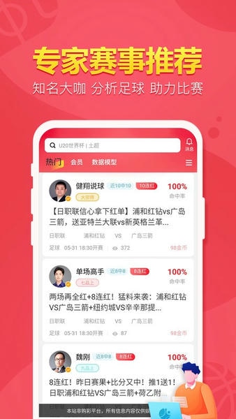 3、汇聚众多知名荐球专家、彩票分析师、体育主持人、解说评论员、运动员,为你带来深度赛事分析。