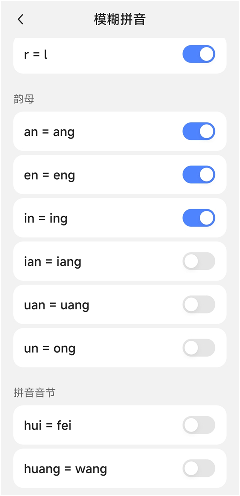 3、下滑开启各声母、韵母、拼音音节的拼音开关即可。