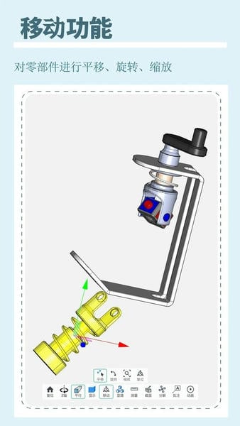 1、支持三维测量,零件操作,装配树,零件显隐控制,剖面分析,爆炸图等功能。
