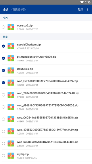 2、长按压缩包可以批量选择