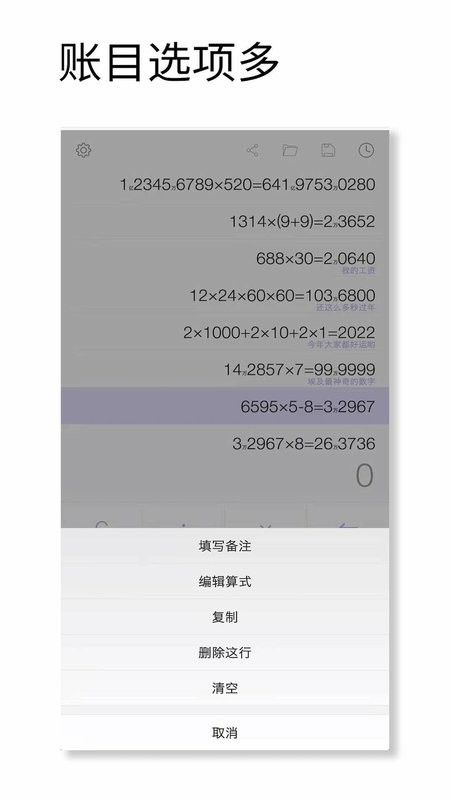 我们这个计算器把“记账”功能融合进来,可以说,记账功能才是重点,他算一笔账,然后可备注上什么什么帐,保存成账本,然后还能打开历史记录,和word、excel那种办公软件一样,打开文件,同时还能继续更正计算,也可把账本发送出去给财务对账使用,可以说是小老板的算账神器了。
