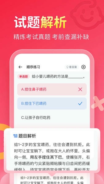 保育员考试宝典可以练习初中高等级别保育员考试题库,包含报名信息、顺序练习、历年真题解析、模拟考试、考前密卷、证书查询、技能考核视频讲解课程等。