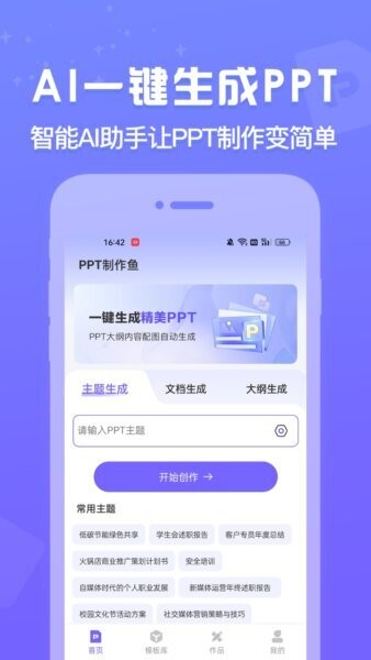 步骤一:选择场景 打开PPT制作鱼,在首页选择“主题生成”或进入模板库,先确定你要制作的是汇报、总结还是活动策划。