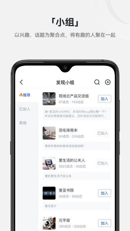 【“圈子、话题”频道】以兴趣、话题为出发点,进行内容、人员聚合信息传播。