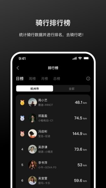 4. 骑行排行榜:包含日榜、周榜、月榜、总榜;支持城市筛选与范围选择(如“全部”);展示排名、头像昵称与骑行里程,形成骑行激励。