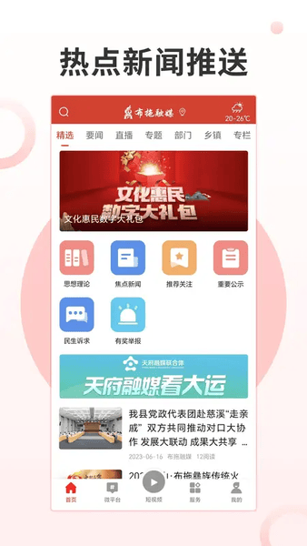 布拖融媒体是一款综合型融媒服务平台,集多种类型的新闻资讯于一体,每天实时更新推送,让用户足不出户就能了解身边的大小事件,还提供了政务服务功能,享受便捷的生活体验。