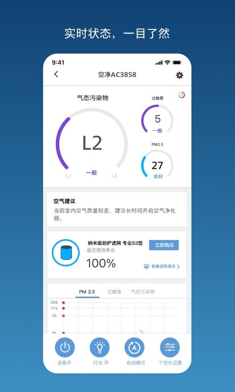 -自动控制,无需打开app,特定情况下自动触发;例如,当室内PM2.5超过30,自动开启空净。
