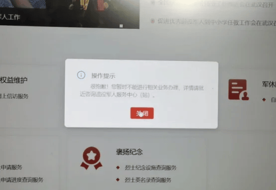 4、如不能正常跳转,并显示如下界面,首先排查注册平台账号时使用的身份证与姓名是否与逐月领取退役金系统中的姓名与身份证号一致,如不一致则需联系安置地退役军人事务部门。