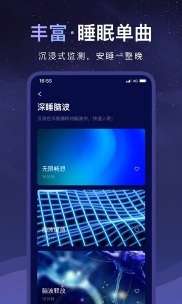 单曲库中包含多种风格的脑波音乐,如“无限畅想”、“脑波缠绕”等,时长从8分钟到16分钟不等,满足不同助眠需求。