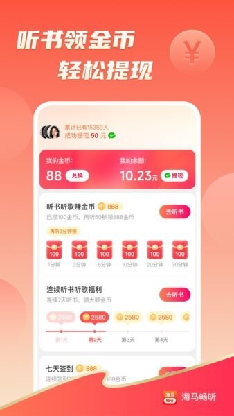 用户听书即可获得金币奖励,金币可兑换现金,鼓励用户持续收听并带来实实在在的收益体验。