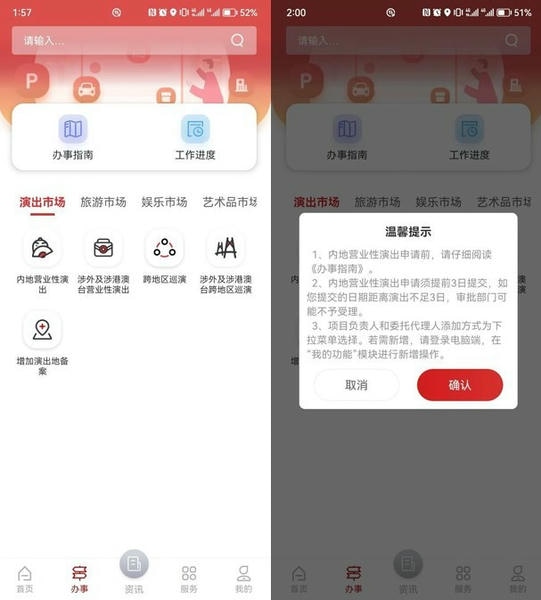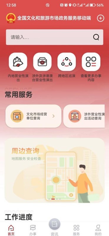 由文化和旅游部市场管理司运行维护的全国文化和旅游市场政务服务移动端,是推进文旅市场政务服务“掌上办”“指尖办”的重要载体,主要包括政策资讯发布、行政审批办理、在线培训学习、电子证照应用等服务事项,并提供用户办理营业性演出、跨地区巡演等入口和查询通知公告、政策法规、办事进度等服务功能。