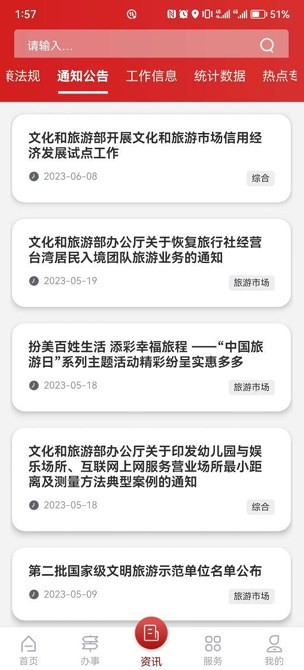 咨讯可查看政策法规、通知公告、工作信息、统计数据。如下图: